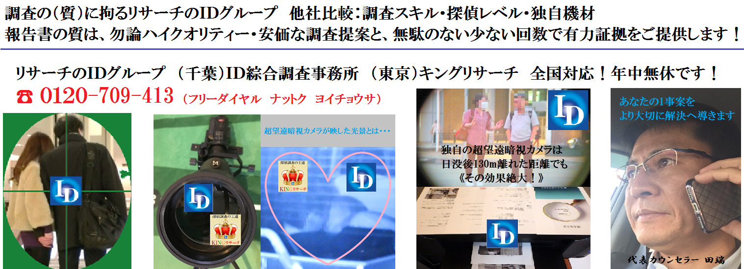 地域で活躍する探偵事務所 柏市近郊の探偵調査・浮気不倫調査・興信所はリサーチのIDグループ リサーチのIDグループ ID綜合調査事務所では、こうした『浮気を認めさせる』『浮気を辞めさせる』『元のさやへ戻る』ためや、『離婚準備』『家庭崩壊』に備えるための〈有力証拠 〉を押さえるための決定打の収集に全力で取り組む千葉県を代表する『総合探偵社』の運営を致しております。...